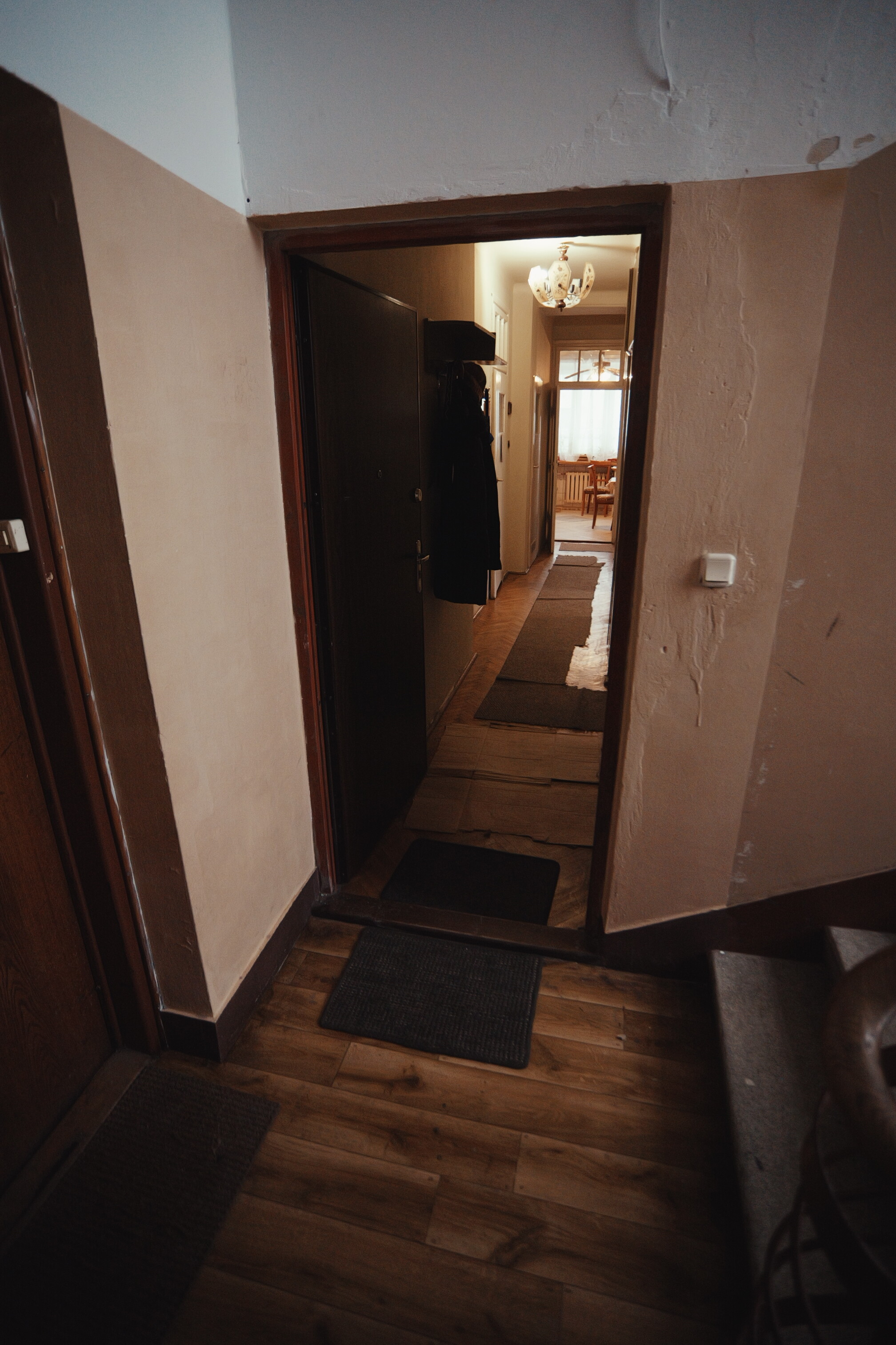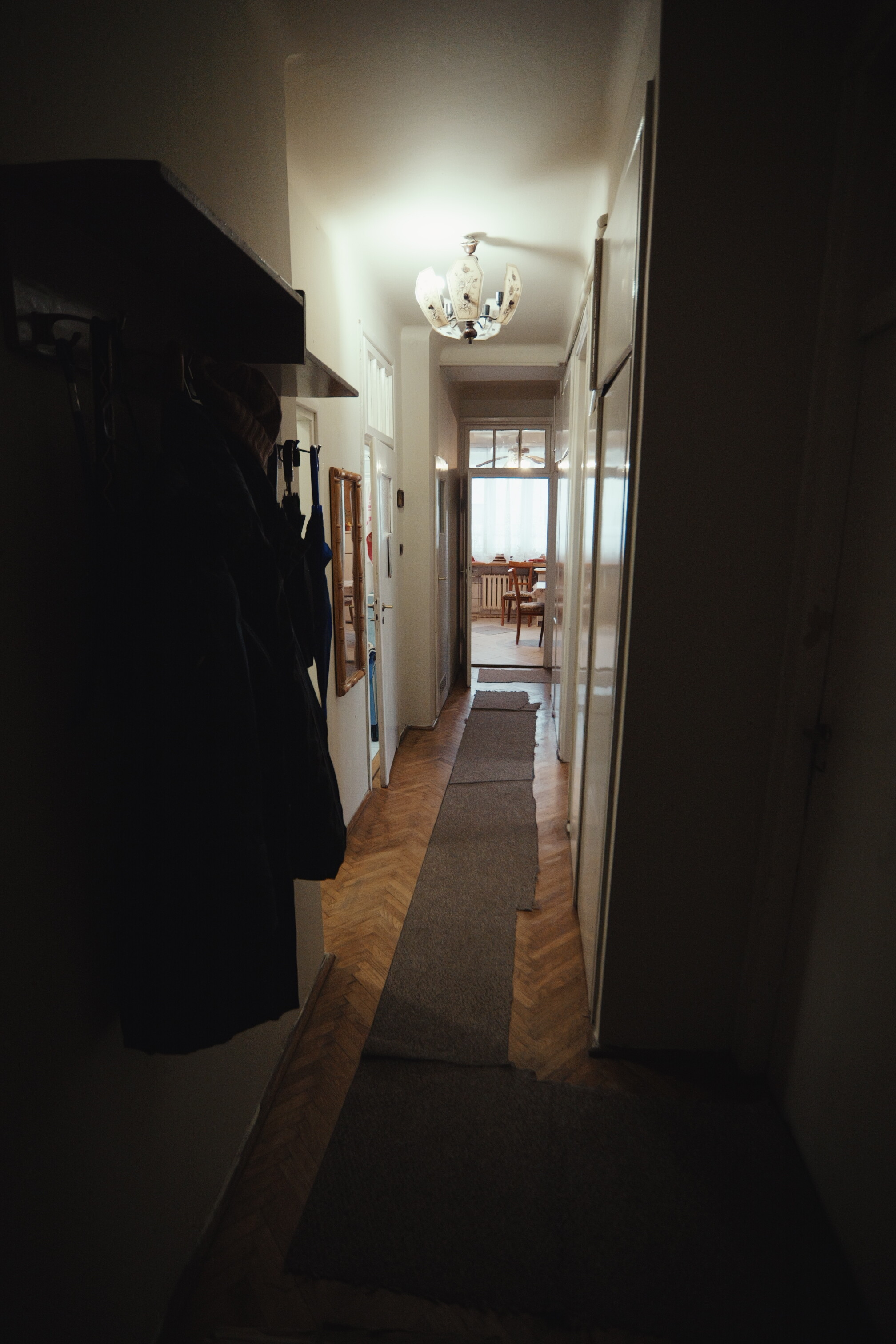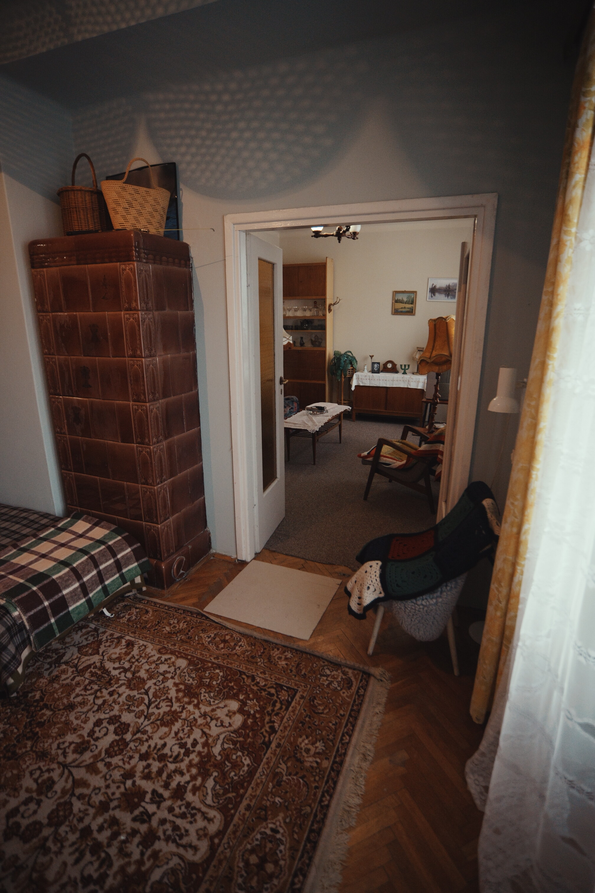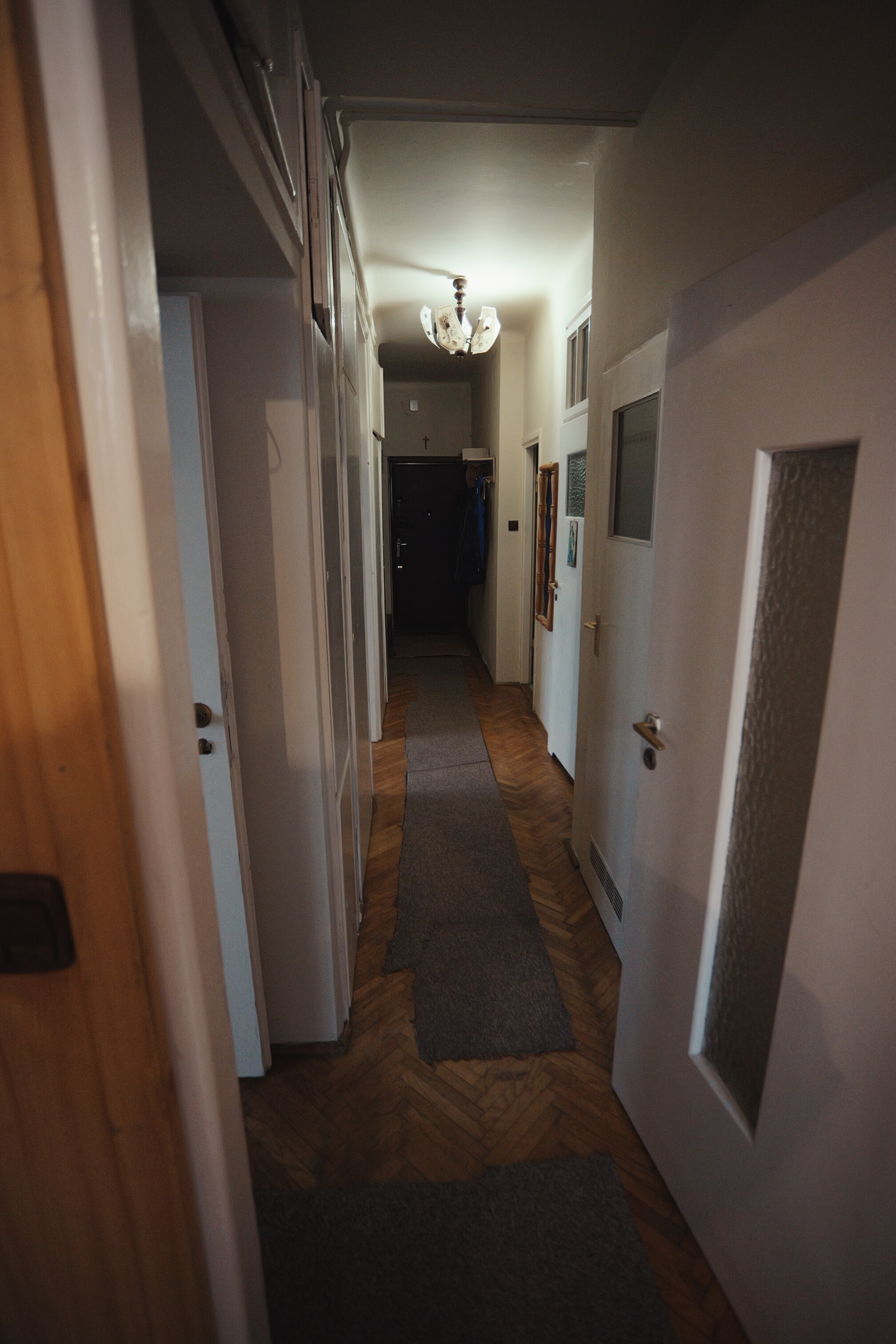 Przedwojenne mieszkanie ze kaflowymi piecami, trzeszczącą drewnianą podłogą, wysokimi sufitami, historycznymi meblami i długim korytarzem.