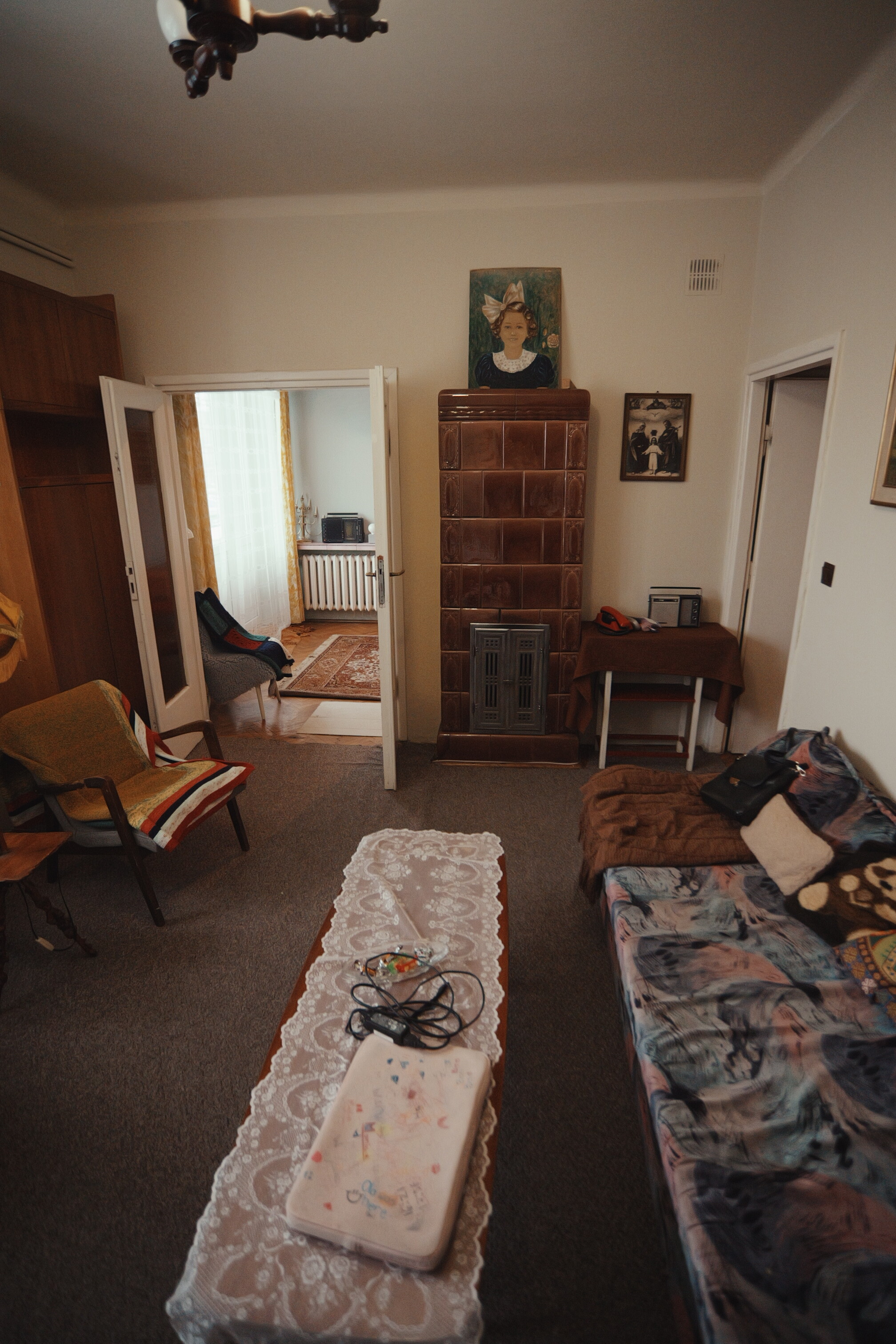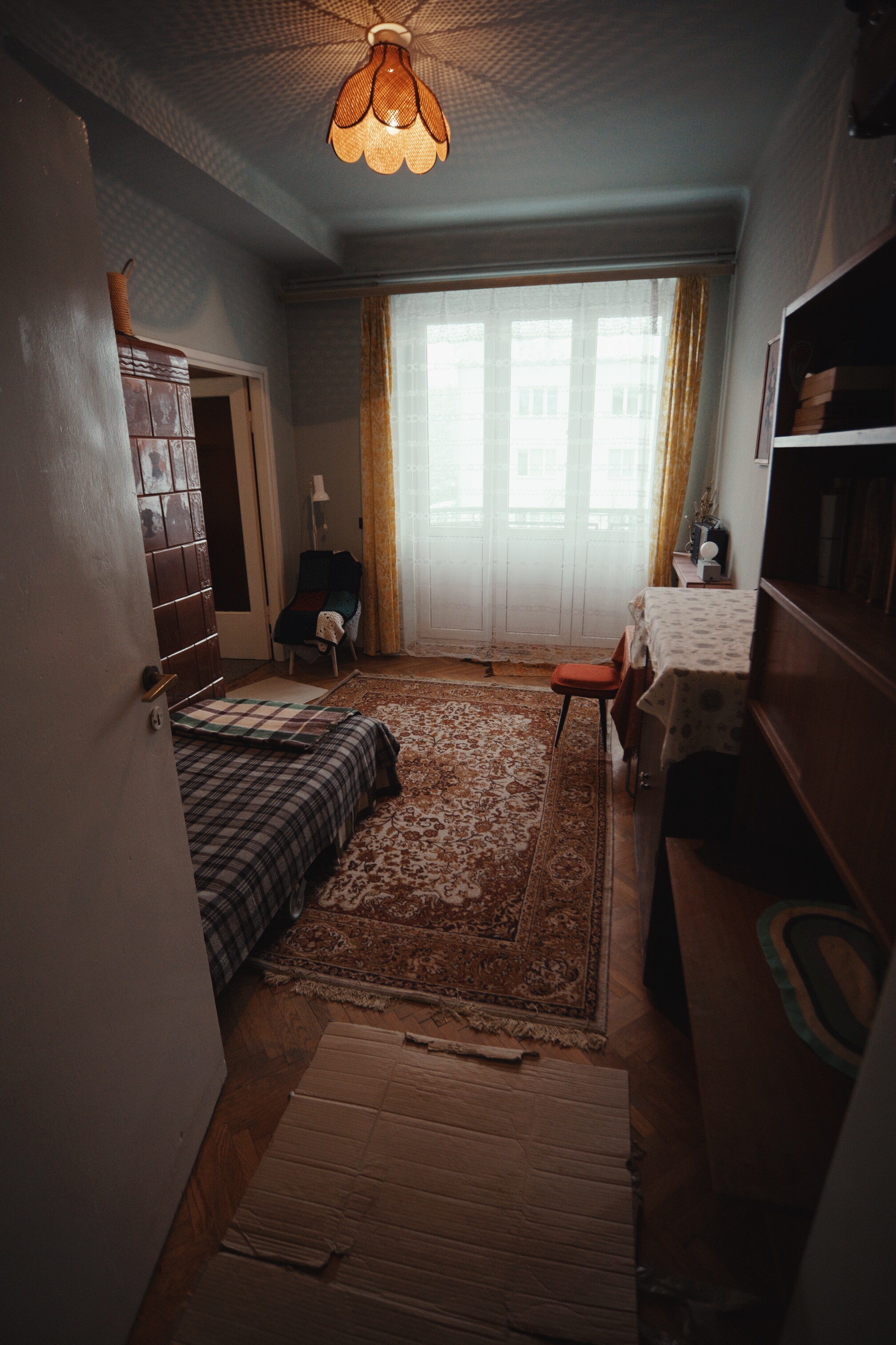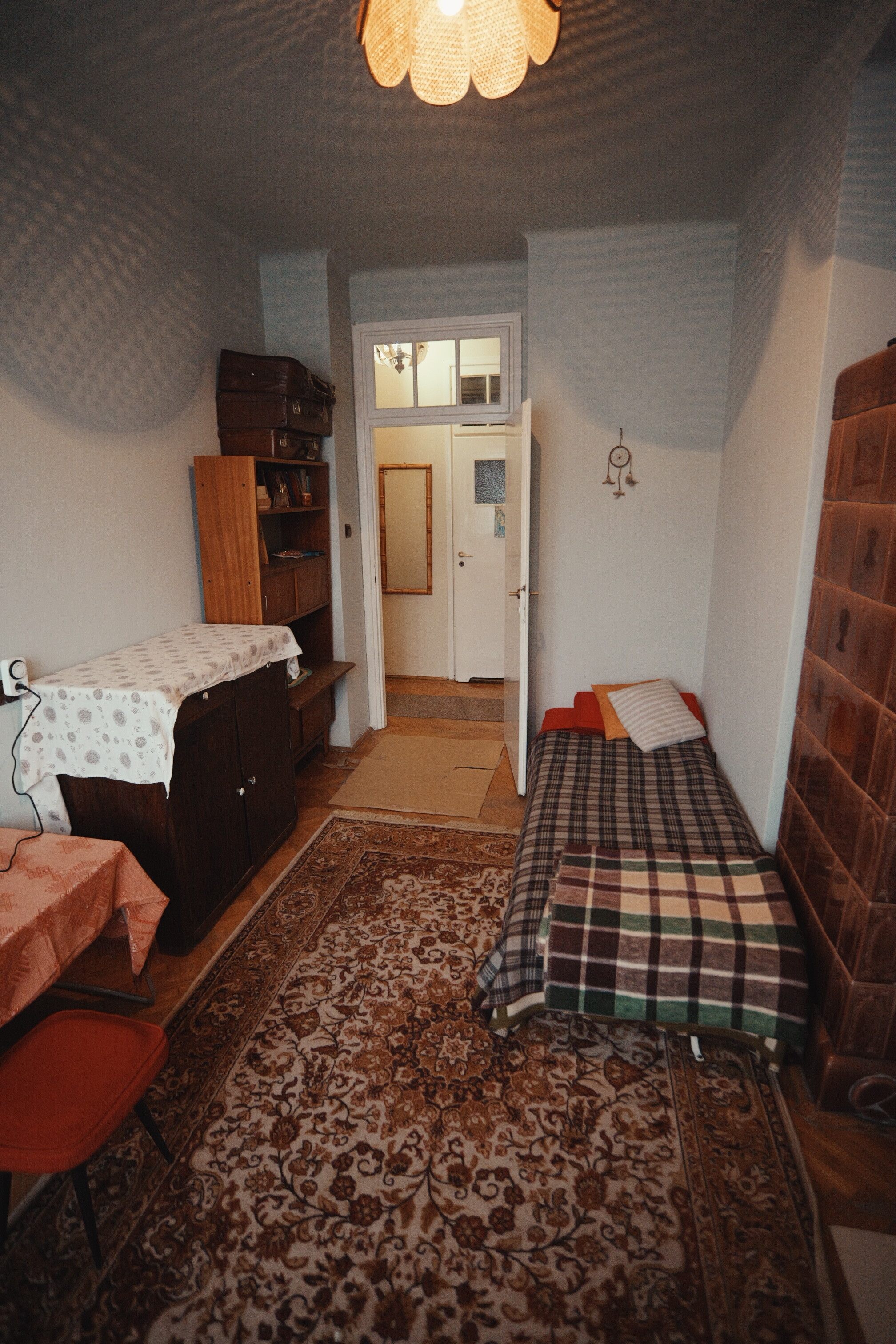 Przedwojenne mieszkanie ze kaflowymi piecami, trzeszczącą drewnianą podłogą, wysokimi sufitami, historycznymi meblami i długim korytarzem.
