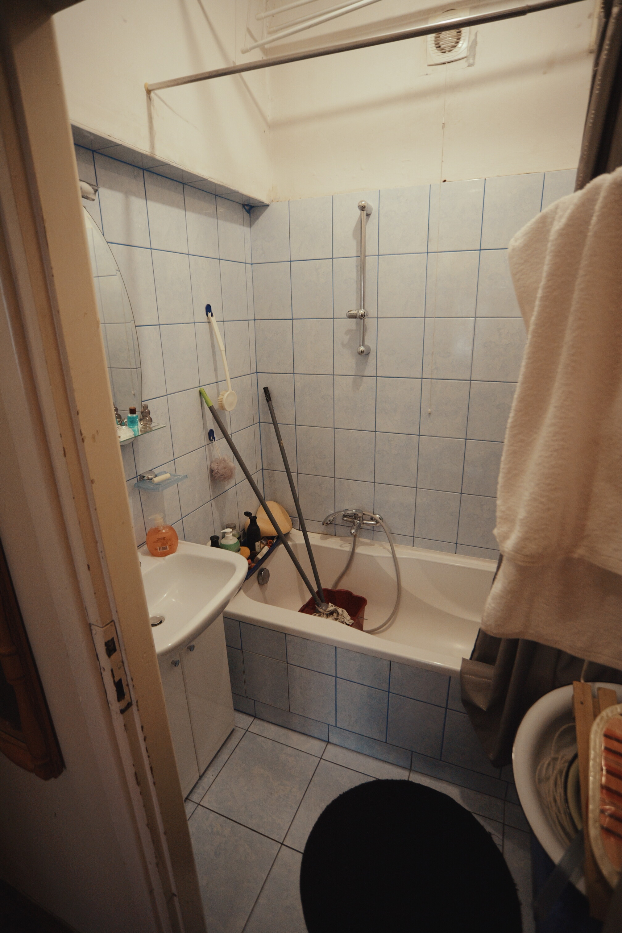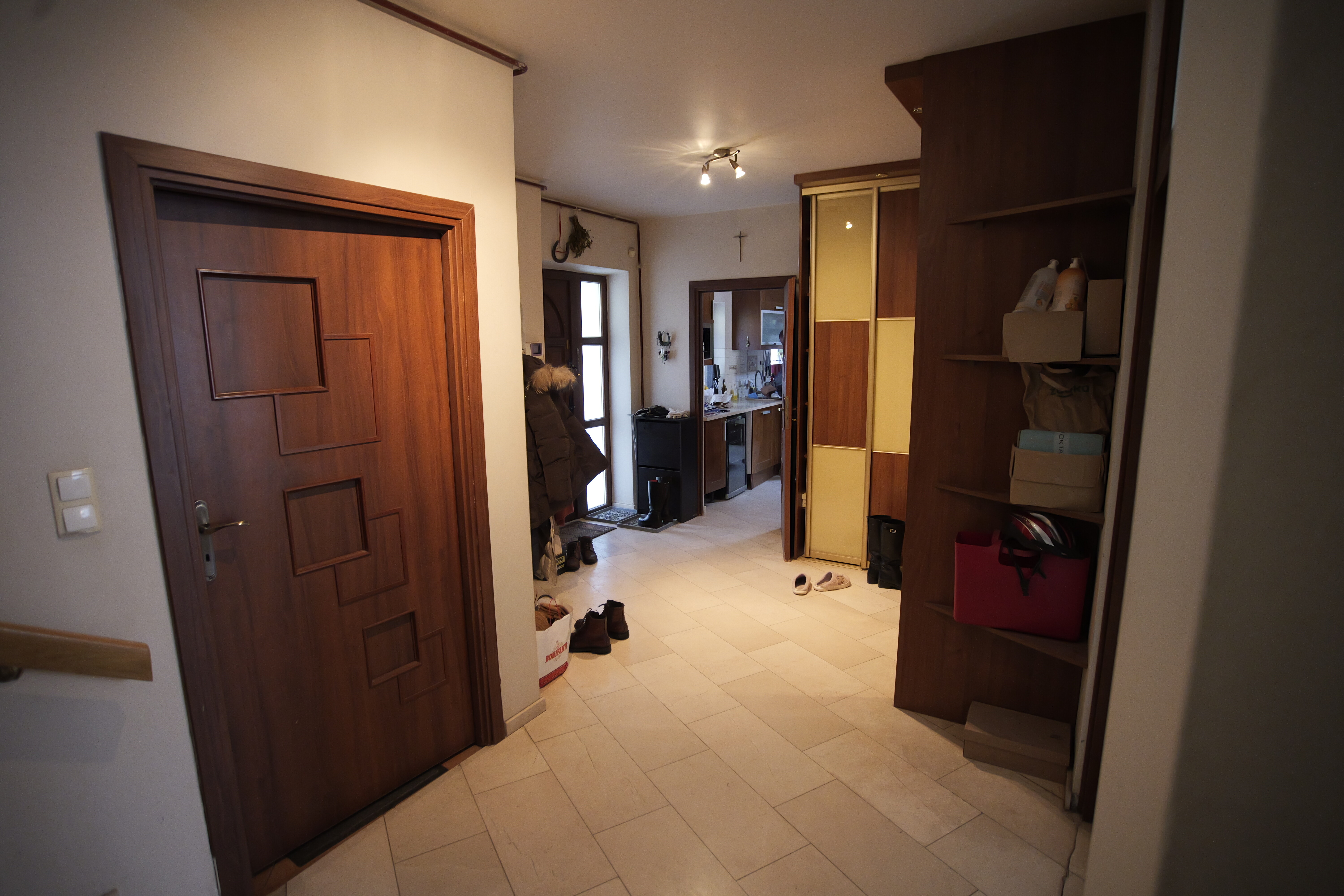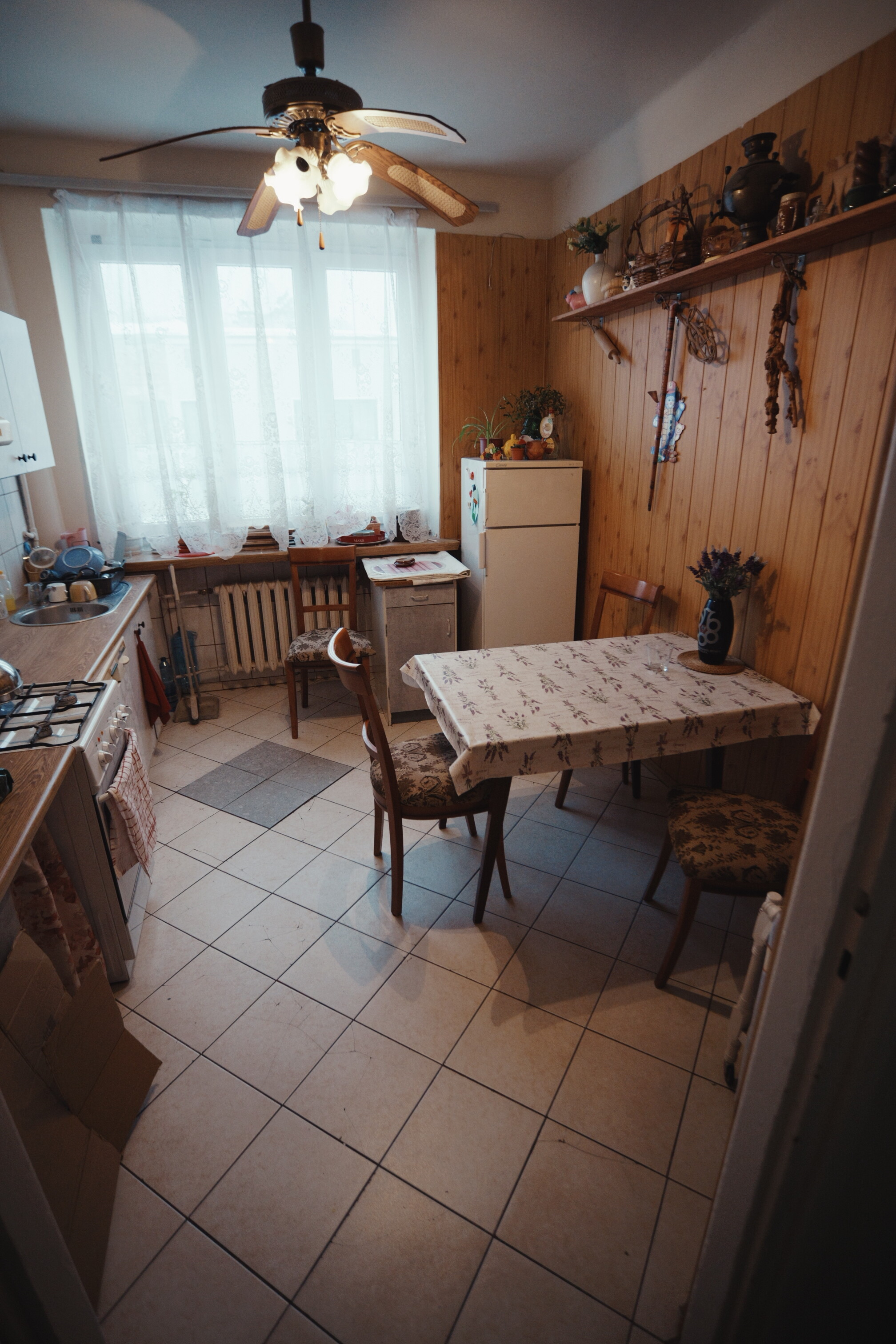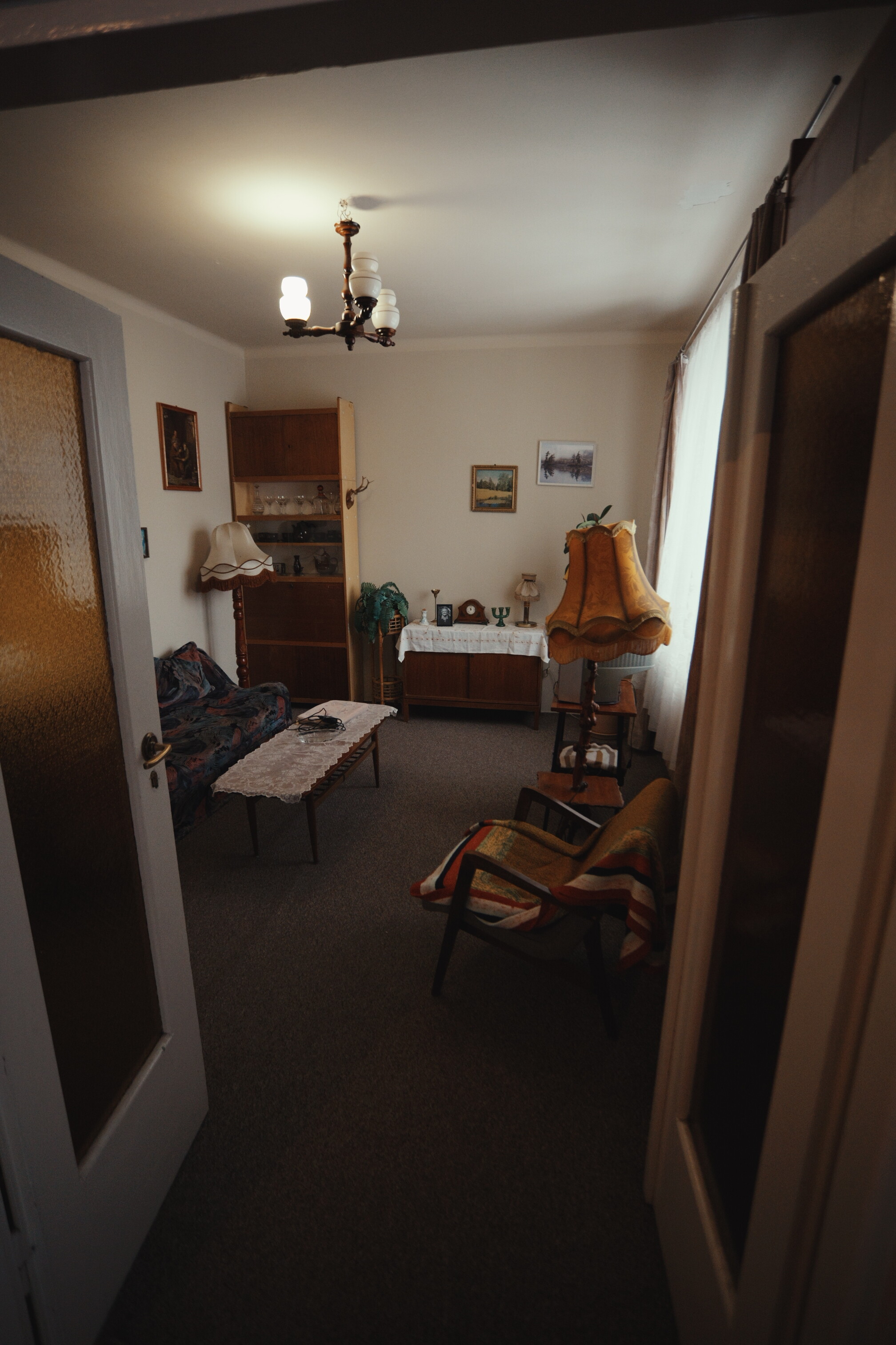 Przedwojenne mieszkanie ze kaflowymi piecami, trzeszczącą drewnianą podłogą, wysokimi sufitami, historycznymi meblami i długim korytarzem.